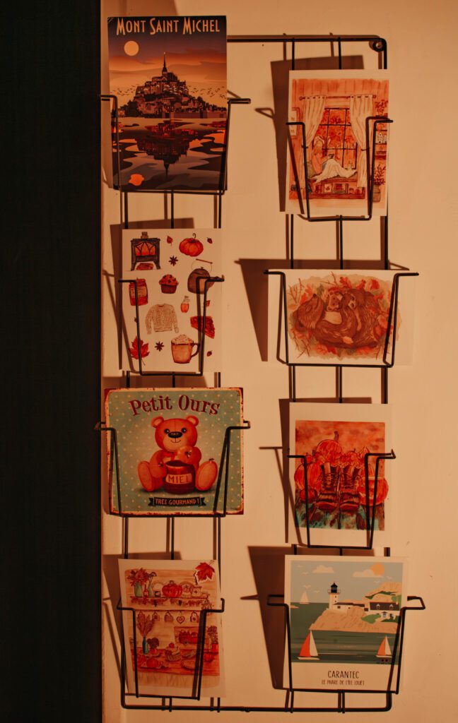 J’ai aussi un petit présentoir mural où je glisse des cartes postales selon les saisons. Notamment les superbes cartes de Caro from Woodland. De jolies cartes aux couleurs chaudes, citrouilles, feuilles colorées… Un détail tout simple qui change complètement l’ambiance de mon salon.